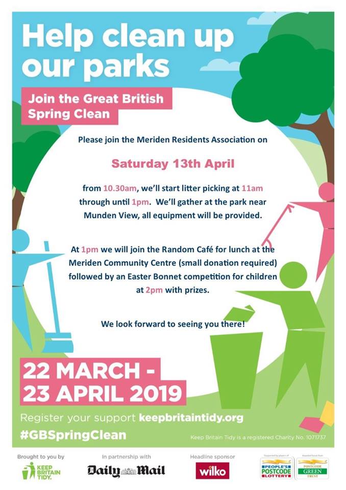 One of our regular venues is The Meriden Community Centre in the heart of The Meriden Ward of Watford. We have been holding our Cafés here for over a year and have got to know quite a few of the local residents. We were recently asked by the Meriden Residents Committee if we would like to join in with their Easter Community Event to be held as part of the Great British Spring Clean.